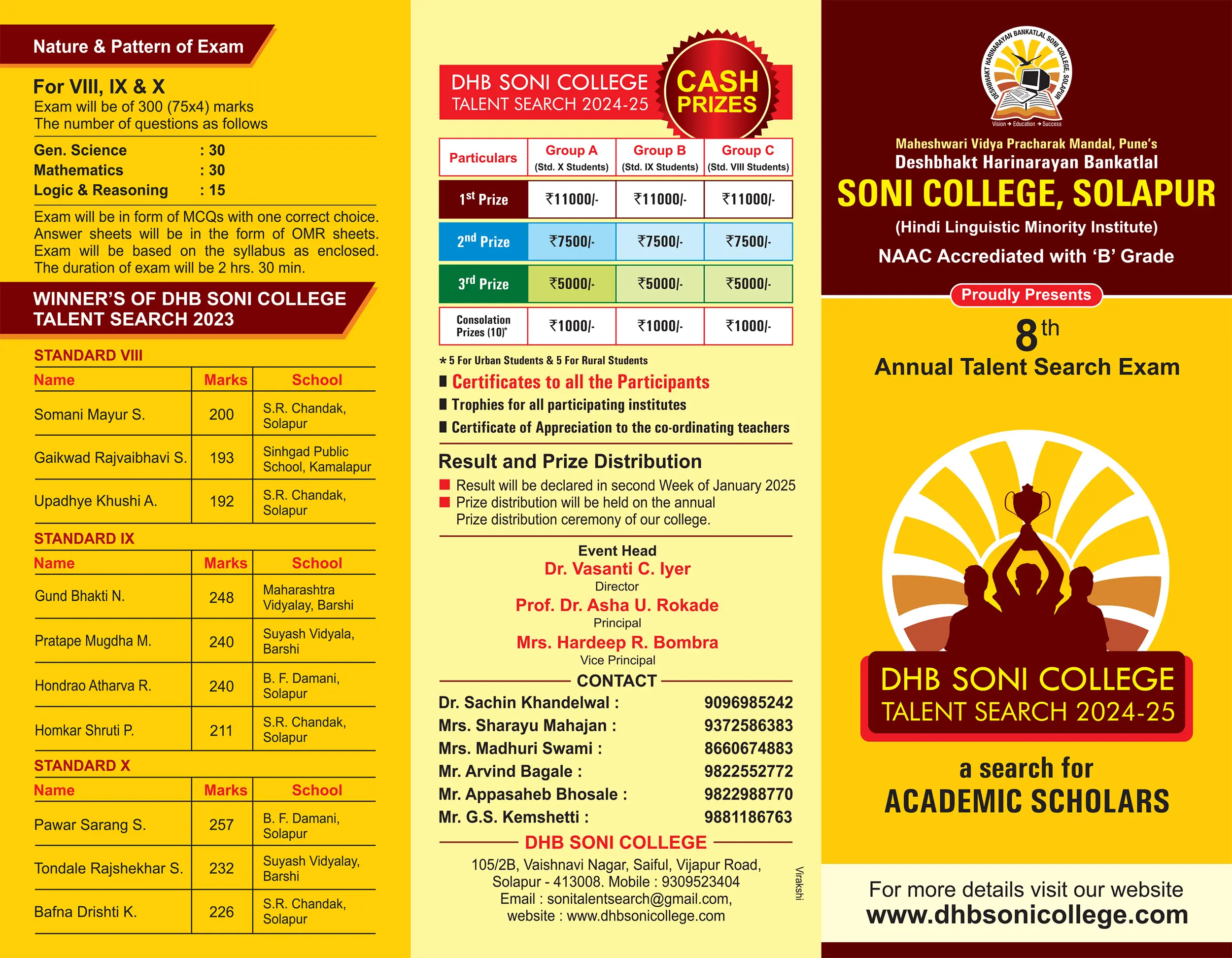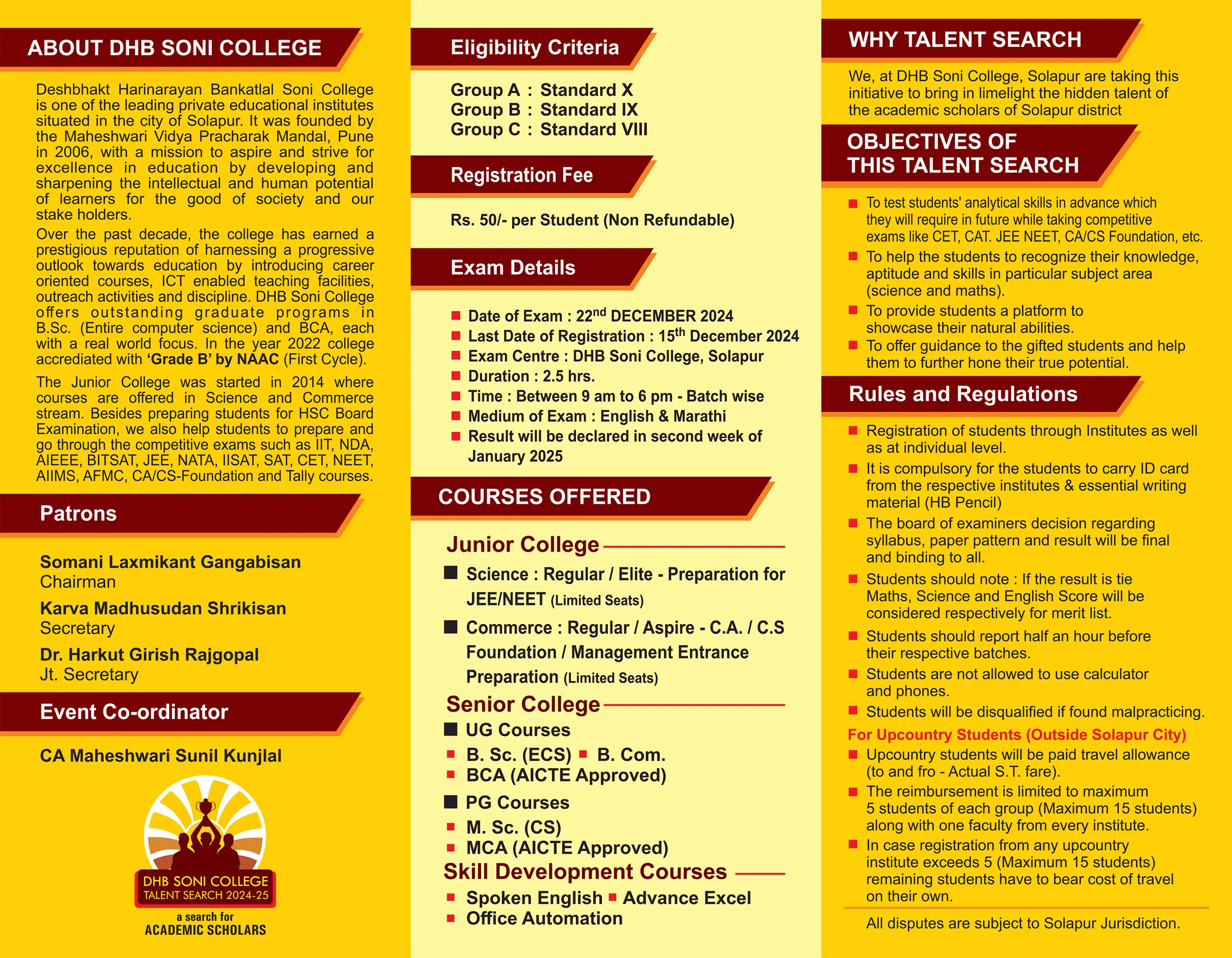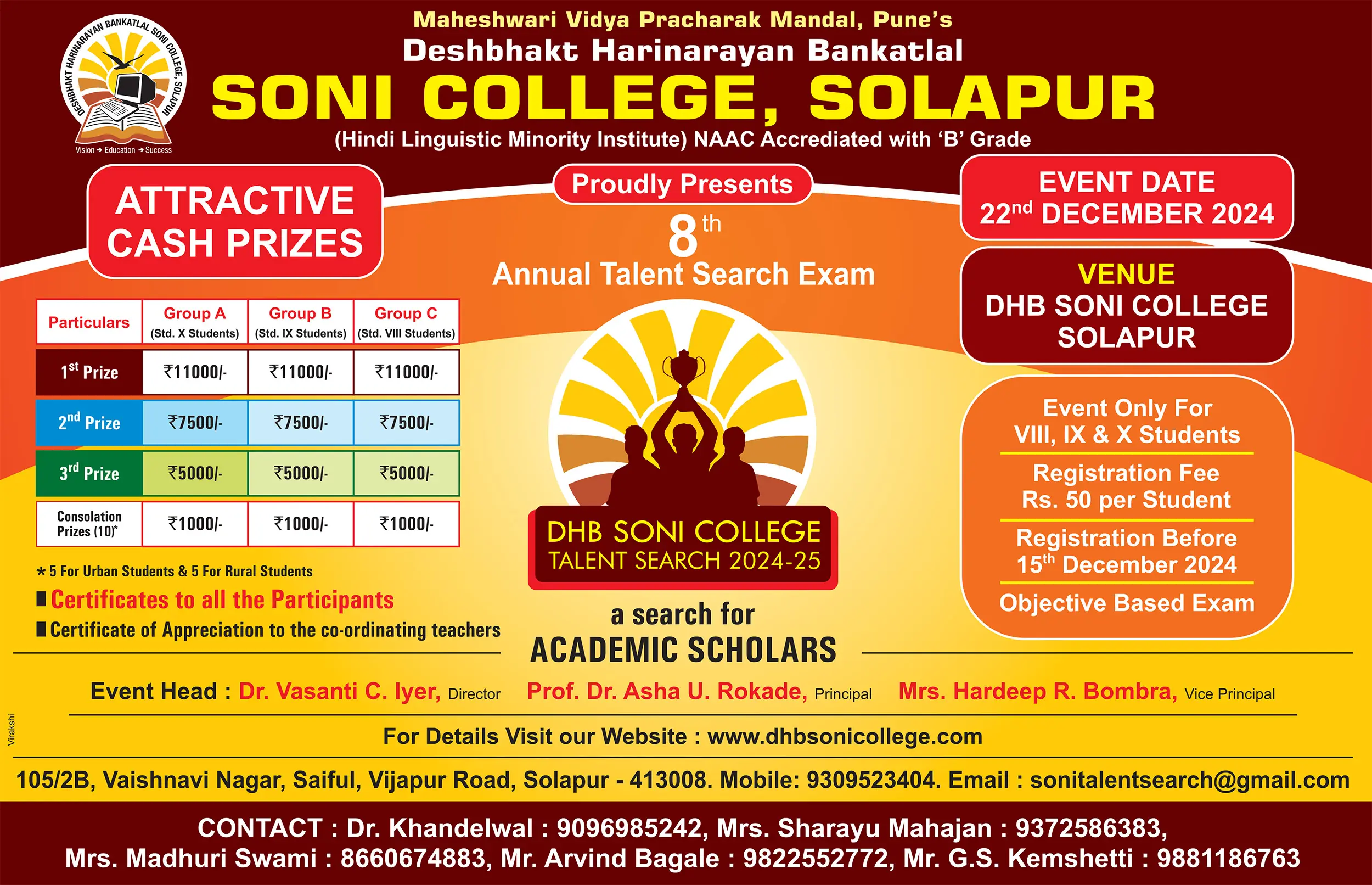 We are excited to announce the 8th Annual Talent Search Exam, organized by DHB Soni College, Solapur! This prestigious examination is designed to identify and nurture the hidden potential of students in Standards VIII, IX and X, helping them sharpen their analytical and problem-solving skills to excel in future competitive exams such as JEE, NEET, CA and CAT.