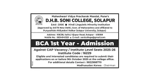 Welcome to the Admissions page of D.H.B. Soni College, where we are dedicated to guiding you through the process of joining our vibrant academic community. At D.H.B. Soni College, we offer a range of undergraduate and postgraduate programs designed to empower students with the skills, knowledge and values needed to excel in today’s competitive world. Our admissions process is straightforward and designed to help prospective students explore their academic interests and career goals. Whether you’re a first-time applicant or seeking advanced education, we are here to support you every step of the way on your journey to academic success.